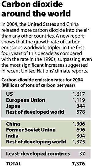 L'accélération d'émissions de CO2 est particulièrement importante dans les pays en développement dont l'économie progresse fortement, en particulier la Chine, où l'augmentation des émissions de CO2 est surtout le reflet de l'augmentation du produit intérieur brut par habitant. Entre 2000 et 2004, les pays en développement ont été les principaux responsables de l'augmentation des émissions de dioxyde de carbone, même si cela ne représente que 40% du total des émissions de CO2 dans le monde. En 2004, 73% de la croissance des émissions dans le monde est venue des pays en développement et des pays moins développés, qui représentent 80% de la population mondiale. La même année, les pays développés (dont l'ancienne Union soviétique) ont contribué à 60% des émissions totales. Ils sont responsables de 77% des émissions cumulées depuis le début de la révolution industrielle, relève l'étude. |