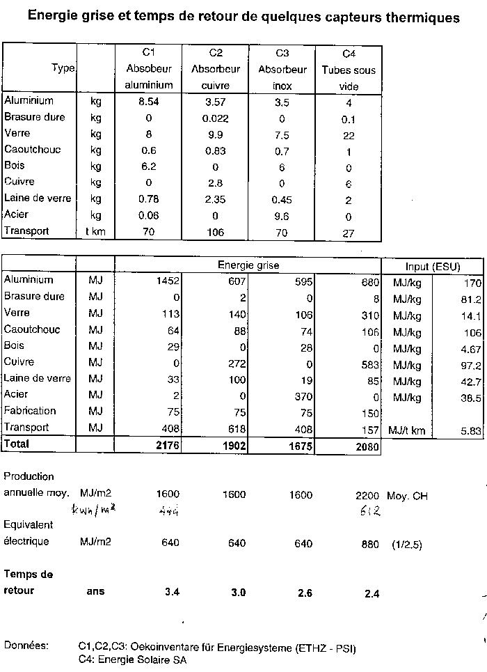 Afin qu'une installation fournisse un certain service de manière fiable, il faut rassembler divers produits en cette installation. Prenons par exemple le cas des capteurs solaires: un chargement de capteurs solaires est livré à une entreprise réalisant des installations solaires. Pour cela, celle-ci nécessaite encore beaucoup de matériel supplémentaire: tuyaux, électronique, isolation, etc. Tout ce matériel est livré en camion. Il faut ensuite construire la fabrique puis la chauffer, etc... Les véhicules qui transportent les équipes de travail et le matériel jusqu'à l'emplacement de l'installation consomment du carburant et doivent être entretenus. Une fois l'installation construite, nous disposons du service souhaité, à savoir de la chaleur fournie par le capteur solaire pendant toute sa durée de vie; mais voilà: quelle est la durée de vie de l'installation? Et il faut peut-être remplacer certaines parties tous les dix ans alors que d'autres foctionneront 30 ans... Mais si l'installation fournit le service désiré, il ne faut aps oublier les exigences de son exploitation (le courant nécessaire à la pompe de circulation) et de son entretien )service technique, pièces de rechange...) qui ne font qu'accroître la quantité d'énergie grise engagée.. A un moment donné, même la meilleure des installations ne fonctionnera plus. Il faudra alors la détruire. Certaines parties peuvent être réemployées, d'autres finissent à la décharge. Mais: comment? ou?... C'est là que la boucle est bouclée: les matières employées se retrouvent là d'où elles viennent, dans le sous-sol... Effet de serre évalué et cumulé Bien que le bilan énergétique tenant comptede l'énergie grise constitue un assez bob étalon de mesure écologique, il ne permet pas de décrire tout-à-fait globalement le profil écologique. Outre la discussion portant sur la raréfaction des supports énergétiques non renouvelables, le problème de l'effet de serre joue lui aussi un grand rôle. Dans la moyenne européenne, les pompes à chaleur modernes à sonde géothermiques n'obtiennent pas de meilleurs résultsts que les chauffage à gaz naturel. Que manque-t-il pour arriver à une évaluation globale? La consommation d'énergie primaire non renouvelable et l'effet de serre sont aujourd'hui les effets environnementaux les mieux connus des systèmes énergétiques. Afin d'obtenir une évaluation aussi globale que possible, il convient toutefois de prendre en compte la consommation d'autres ressources importantes: émissions nocives rejetées dans l'air, métaux lourds, pollution de l'eau, radioactivité, déchets, matériaux nécessaires, transports, surfaces de terrains et tant d'autres encore. Quel est le pire de ces deux maux: l'effet de serre ou la radioactivité libérée? En conclusion Quels que soient les effets sur l'environnement pris en compte, il n'y a que les systèmes suivants qui offrent de véritables avantages écologiques: l'énergie solaire, le bois et les économies d'énergie (isolation supplémentaire dépassant les normes actuelles; emploi rationnel de l'électricité: par exemple ampoule économique au lieu de l'ampoule conventionnelle ou encore utilisation de l'énergie thermique résiduelle d'une centrale thermique pour le chauffage à distance (CTCD) ou encore pompe à chaleur en lieu et place du chauffage électrique à accumulation. Information: