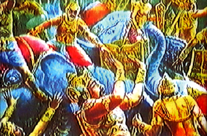 Il fait mention de missiles et d'armes mortelles. Dans la Drona Parva - une section du Mahabharata - on décrit une bataille antique. "On parle d'un combat où une arme explosive puissante détruisit des armées entières, causant des amas informes de guerriers, d'éléphants et d'armes, emportés comme des feuilles mortes", dit Ganguli. "Au lieu du champignon atomique classique, le poème décrit une explosion perpendiculaire avec des nuages de fumée qui s'ouvrent, l'un après l'autre, pour former un gigantesque parapluie. |