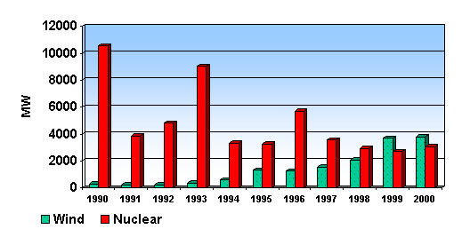 Additions to wind energy capacity worldwide totaled 3,800 megawatts (MW) in 2000, according to figures from the European Wind Energy Association (EWEA) and AWEA. Some 3,056 MW of new nuclear capacity was installed in 2000, according to the International Atomic Energy Agencyís (IAEA) Public Reactor Information System. In 1999, additions to wind generating capacity totaled 3,600 MW and additions to nuclear, 2,700 MW.