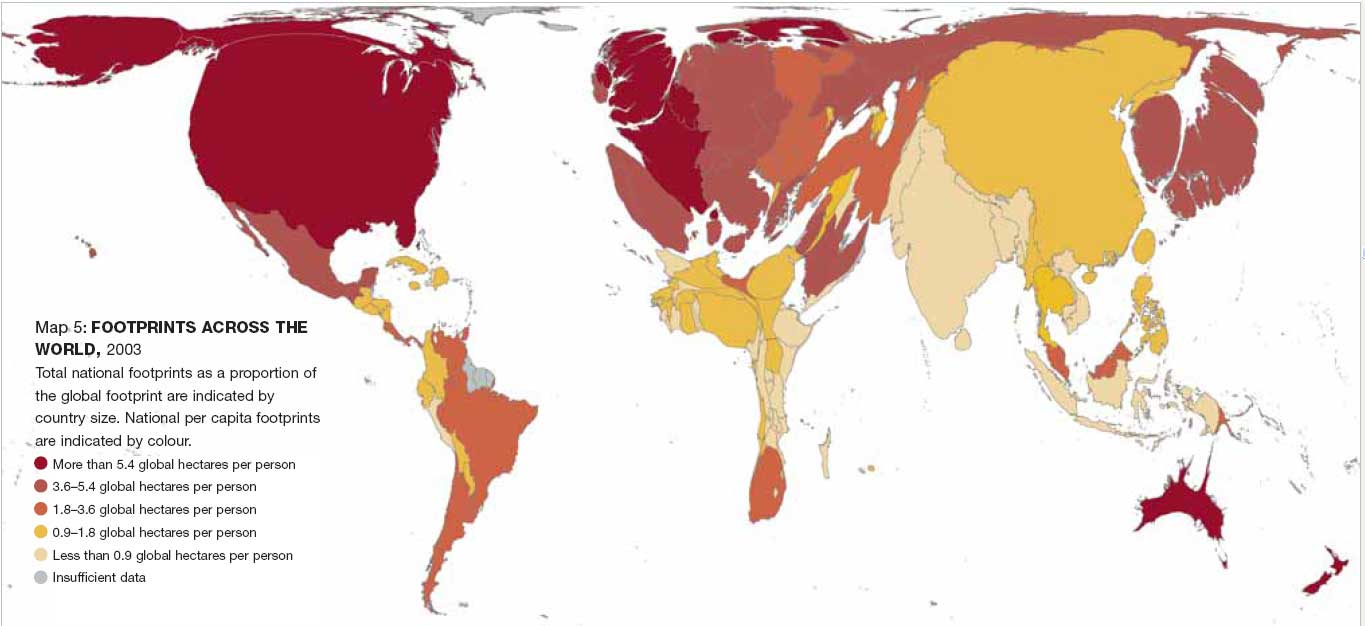 Faut-il donc retourner à l'âge de la pierre? Non, en utilisant plus rationnelement l'énergie, on peut réduire sont empreinte écologique de 75% sans perte de confort Des exemples (Ecolife.be): * 1000 km en moins en voiture (7l/100km) économisent 815m2 (+ de 8ares) * un autocollant pour refuser les imprimés publicitaires économise 826m2 * sécher le linge sans séchoir, 1250m2 * 1 jour sans viande par semaine pour une famille de 4 pendant 1an, 3300m2 * 1kg d'haricot verts frais plutôt que congelés, 5m2 Voir également: http://www.earthday.net/footprint/index.asp www.actioncarbone.fr · Voir également "l'empreinte nationale" par rapport à l'"empreinte globale: http://www.online-adventskalender.info/2006/images/footprint_worldmapper.jpg L'«empreinte nationale» par rapport à l'«empreinte globale» est représentée selon la taille du pays concerné: ![]() |
