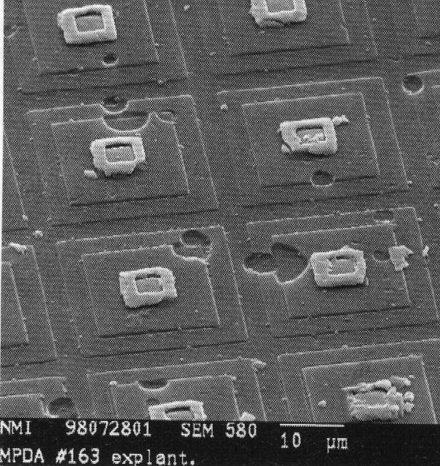 Deutlich sind Löcher in der Schutzschicht aus SiO2 und im darunterliegenden Si sichtbar. |
