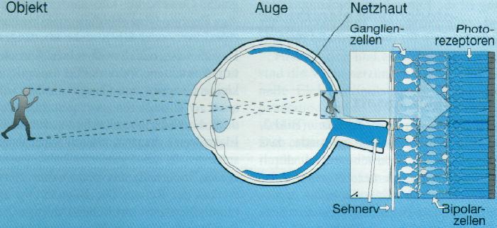 weitergegeben. Schliesslich wird die durch die Netzhaut laufende neuronale