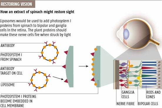 Exclusive from New Scientist Print Edition. A truly extraordinary cure for some forms of blindness is being proposed. The idea is to add light-absorbing pigments from spinach to nerve cells in the retina, to make the nerve cells fire when struck by light. Eli Greenbaum's team at the Oak Ridge National Laboratories in Tennessee has been exploring this possibility for several years. In their latest experiments, the researchers have shown that adding plant pigments to human cells makes the cells respond to light. The technique would restore only limited vision at best - people would be colour-blind, for instance - but Greenbaum thinks it could provide far better resolution than the electronic retinal implants being developed. Degenerative diseases of the retina such as retinitis pigmentosa and macular degeneration are among the most common forms of blindness in developed countries. These diseases affect rods and cones, the photoreceptor cells at the back of the retina, but the nerve cells in front of them usually remain intact. Experiments with implants that consist of an array of electrodes have shown it is possible to restore at least rudimentary vision by stimulating these nerve cells directly |