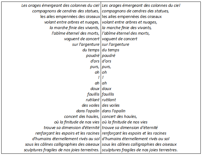 ont vieilli d'une glorieuse parole du monde, lointaine, suspendue régnant au cœur des heures incertaines et des creusets sinueux d'une terre insondable À la source des chemins silencieux surgis du mystère ruisselant de l'aurore les frissons d'une mélancolie de l'air sont l'escale des grains du temps Les sentiers suspendus dans les ombres brossent des tableaux éphémères et les flammes parfumées du jour succèdent aux chants nacrés de la nuit La lumière et les ombres, le Soleil et la Terre sont des diamants resplendissant dans l'espace, le chant des oiseaux dans le duvet des reflets et la danse des ruisseaux paraphent les songes |