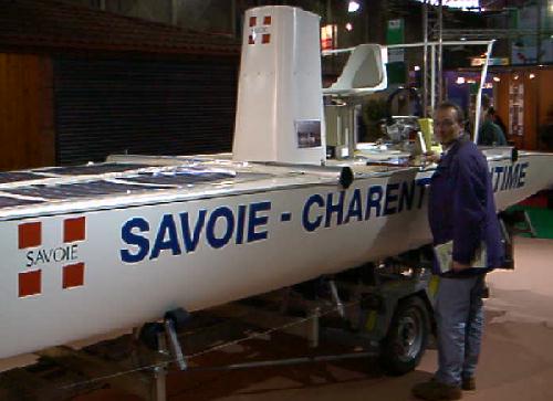 A l'entrée du salon était exposé le bateau solaire accompagnateur d'aviron de CREA2000/ASDER , avec ses 6 modules photovoltaïques qui lui assurent une vitesse maxi de 30km/h.