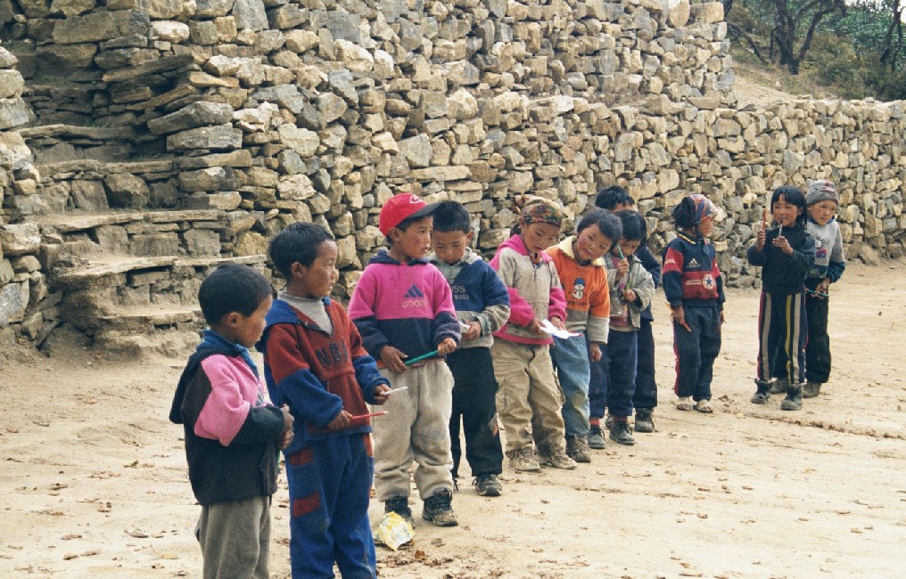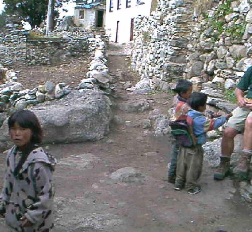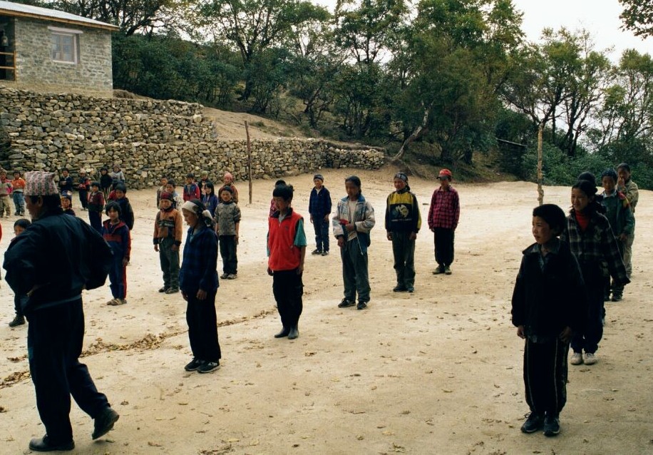 La tête des "casques à pointe en short à brettelles" au lodge de Phortse en nous voyant dévorer notre steak (de Yack hyper cuit) - pomme de terre frites à la parisienne, cela faisait trop longtemps, on ne pouvaient plus résister. Et puis on avaient bien mérité de la Patrie, nous étions arrivés à la plus haute école de la vallée, nous pouvions donc nous décharger des quelques objets gardés précieusement jusqu'à maintenant que l'on nous avait dit d'emmener; aiguilles, fil, fringues, stylos d'abord pour la famille d'accueil du Lodge puis nous montâmes ensuite à l'école, où auparavant le maître nous avait dit de repasser, le temps d'avoir toute les classes rassemblées pour faire une distribution équitable; car la rumeur circulait qu'à la dernière visite d'occidentaux, la distribution n'avait pas été effective…