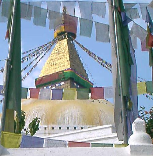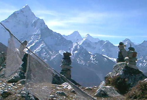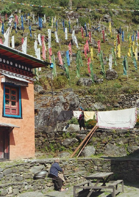 NB: Le paysage toujours grandiose, qu'il faudrait le rappeler à chaque ligne. Les forêts de petits drapeaux de couleurs à Ghat autant d'âmes en attente de partance pour l'au-delà. Et toujours ces prières partout sur les banderoles de couleur, sur de petits papiers coincés entre les pierres sur les cairns des sommets, peints sur des immenses rochers, sur les moulins à prières. Incantations aux monastères à coups de petites cloches et de grands gongs. Népal terre de spiritualité, le 21ème siècle sera spirituel ou ne sera pas qu'il disait? Mais ici cela date de la nuit des temps. Et un métro de retard, un.