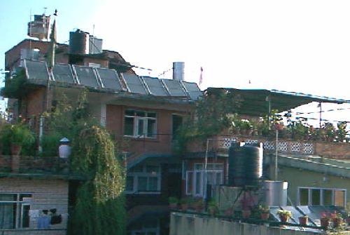 Au Népal, la saison sèche et ensoleillée ne dure que 4 mois (octobre-janvier), c'est la période où la manne financière du tourisme est à son comble dans un pays qui en a le plus grand besoin. Aussi, les népalais assurent au mieux à leurs hôtes un petit confort « à l'occidentale » (eau chaude et électricité…) Dans le quartier touristique de Thamel à Katmandou, nombreux sont les panneaux d'eau chaude solaire qui côtoient en terrasse les réservoirs d'eau de chaque bâtiment: