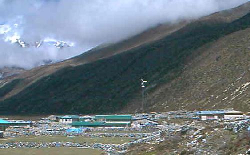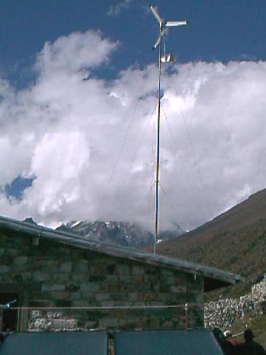 Mais le plus surprenant, fut en arrivant à Pheriche, au terme d'une bonne semaine de marche, (de crasse aussi), croyant arriver au bout du monde puisque situé à 2 jours de marche du camps de base de l'Everest. Vue de loin, au milieu des Yacks, une éolienne émergeait du village, en se rapprochant un peu, le bâtiment adjacent représentait le panel complet d'une autonomie énergétique basée sur les énergies renouvelables ; eau chaude solaire et toit photovoltaïque, à l'intérieur, un ingénieur anglais à la barbe de Neptune était tout heureux de nous proposer de faire la visite technique, et sous nos yeux ébahis de nous montrer des douches et lavabos (rare dans ce coin du globe) d'où jaillissait de l'eau brûlante (encore plus rare), nous étions arrivés à :